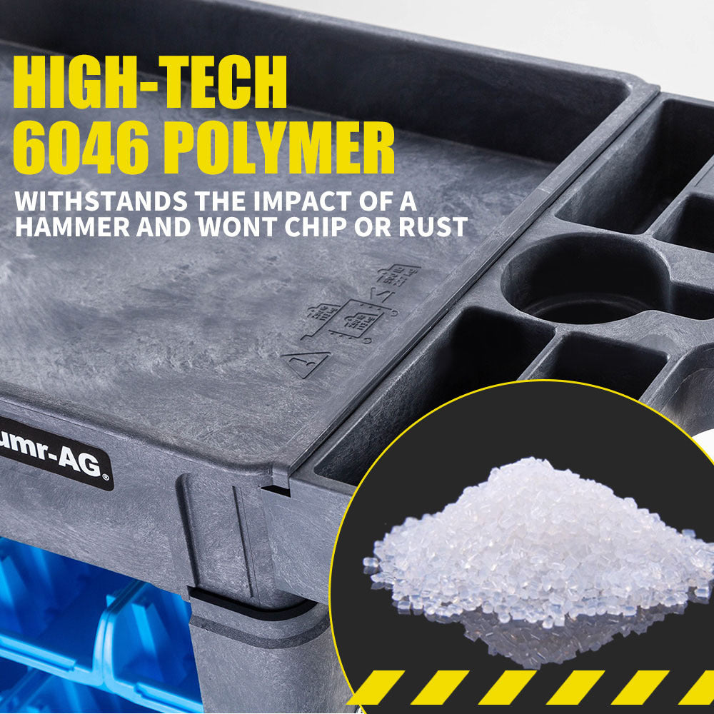 Thanks to its rugged construction the Baumr-AG Bin Cart is virtually maintenance free and easy to clean. Made of heavy duty 6046 polymer it will not dent rust or chip. Add to that you save a lot of precious work space with its dual-sided design.