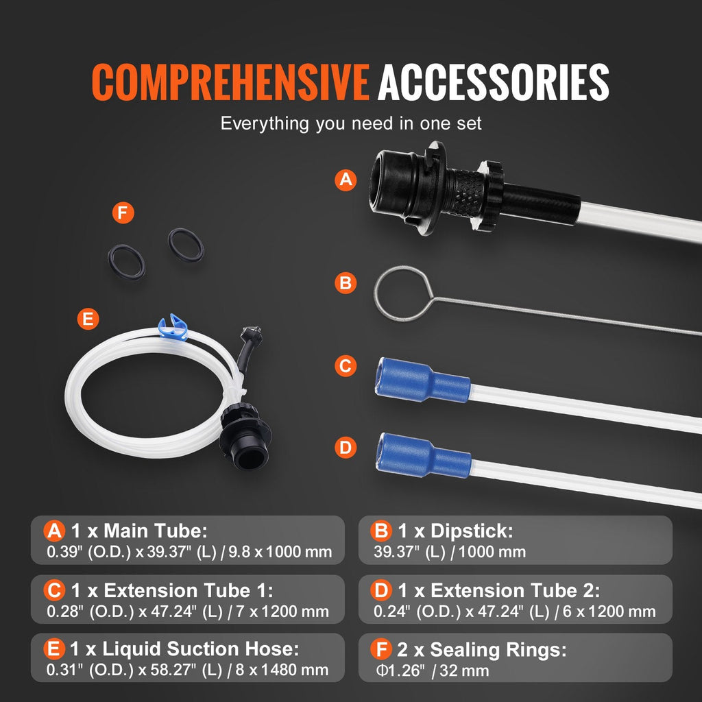 With Four Sizes Of Suck-It-All-Up Oil Extractor Tubes You're Reaching The Deepest Depths Leaving Tanks Dry. Main Tube: 9.8" X 39.37" / 249 X 1000 Mm; Extension Tube 1: 0.28" X 47.24" / 7 X 1200 Mm; Extension Tube 2: 0.24" X 47.24" / 6 X 1200 Mm; Suction Hose: 0.31" X 58.27" / 8 X 1480 Mm.