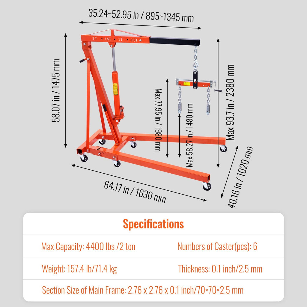 Vevor's Hydraulic Engine Hoist Has A Powerful Engine Crane And A Standard Leveling Tool. Say Goodbye To The Hassle Of Purchasing Separate Equipment As Our 2-In-1 Engine Hoist Provides Everything You Need For A Time-Saving And Labor-Saving Experience.