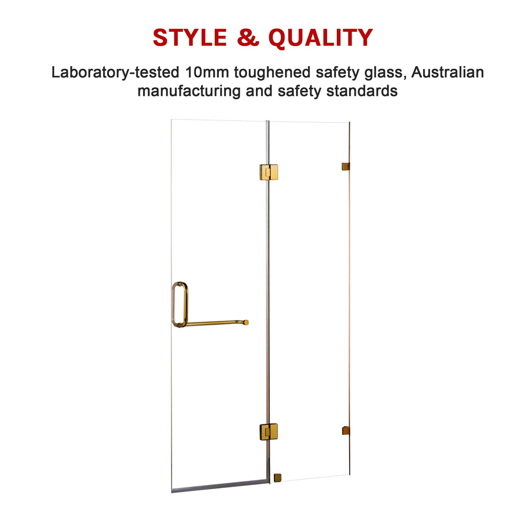 Designed To Meet Australian Standard As/Nzs 2208:1996 This Frameless Shower Screen Features 10Mm Tempered Safety Glass And Premium Gold-Finished Brass Hardware Including A Bold Square Handle And Corner Support Shelf.