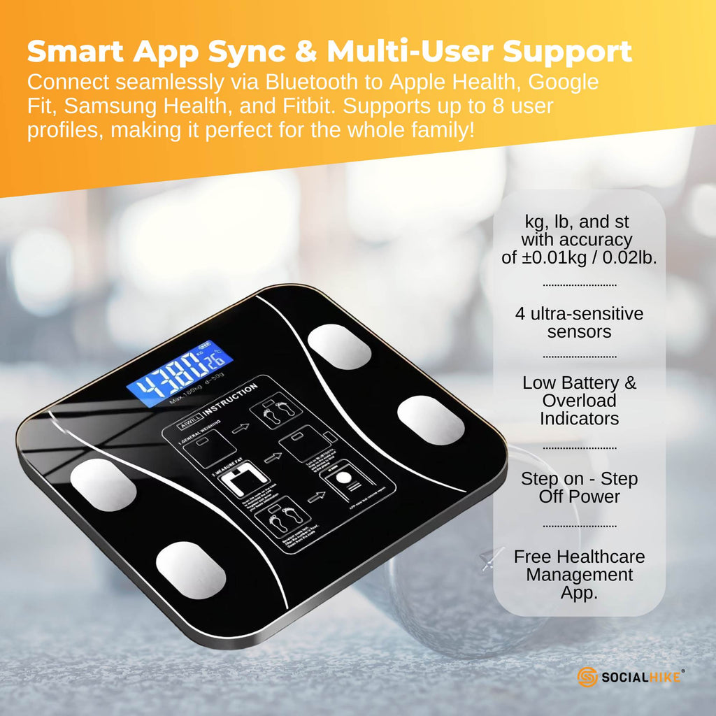 • Strong>Smart App Sync Multi-User Support – Connects Via Bluetooth To Apple Health Google Fit Samsung Health Fitbit With Support For Up To 8 Users Making It Perfect For The Whole Family.