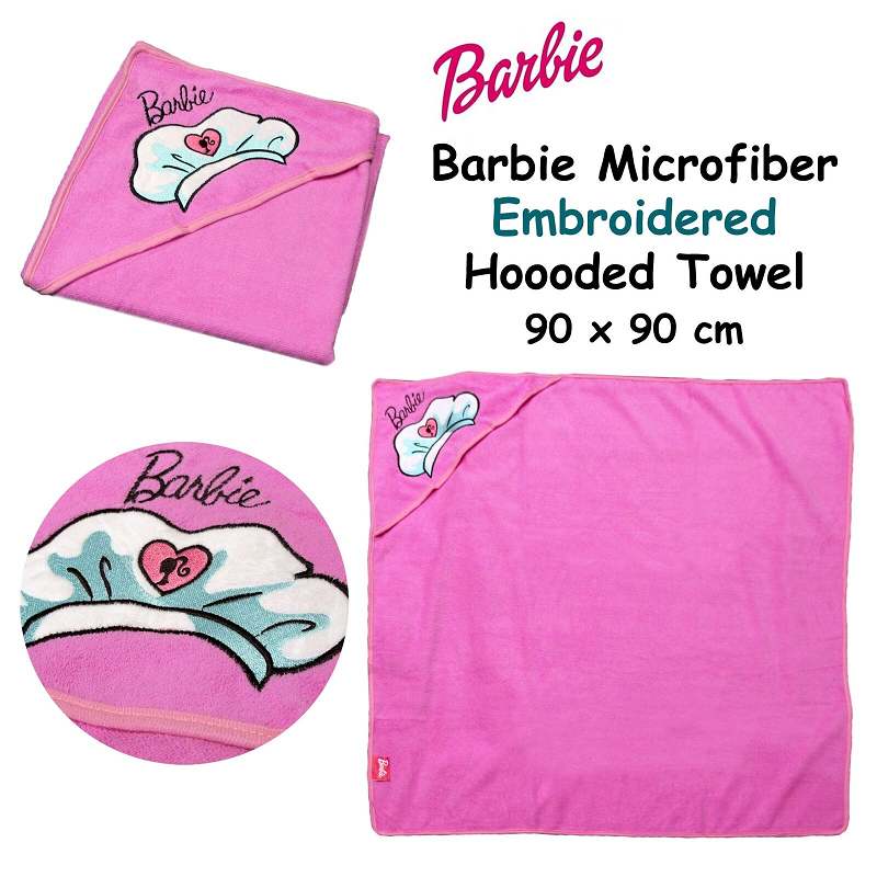 This Handy Barbie Embroidered Microfiber Hooded Towel 90 X 90 Cm Is Lightweight And Quick Drying. Your Little Princess Will Be Excitedly Looking Forward To Bath Time With Its Beautiful Embroidered Barbie Headdress Design In Girly Colour Tones Of Pink Black White And Turquoise That Add Style To Bath Time. For Kids Above 4 Years Old. It Is Made From Quality And Absorbent Microfiber Fabric.