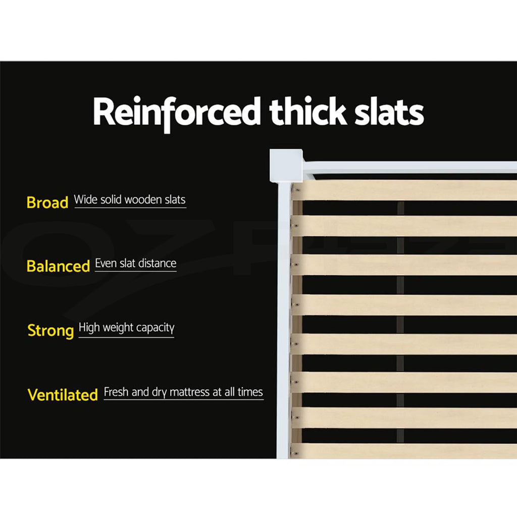 Made Of Natural Pine Wood The Rio Bed Frame Is Ideal For Your Kids As It For Any Adult. Strong And Sturdy The Bed Frame Comes With A Solid Timber Slated Base Stylish Headboard Heavy Duty Steel Fixings And Smooth Edges All Round. Finished In A Non-Toxic White Paint The Neutral Coloured Bed Frame Makes For Easy Decoration Coordination With Any Bedroom. The Bed Frame Becomes An Instant Storage Area With Acres Of Space For Your Essentials. Go Extra Neat And Tidy. So Create More And Expand Your Home Storage Capacity With The Artiss Rio Bed Frame. Get Yours Today.