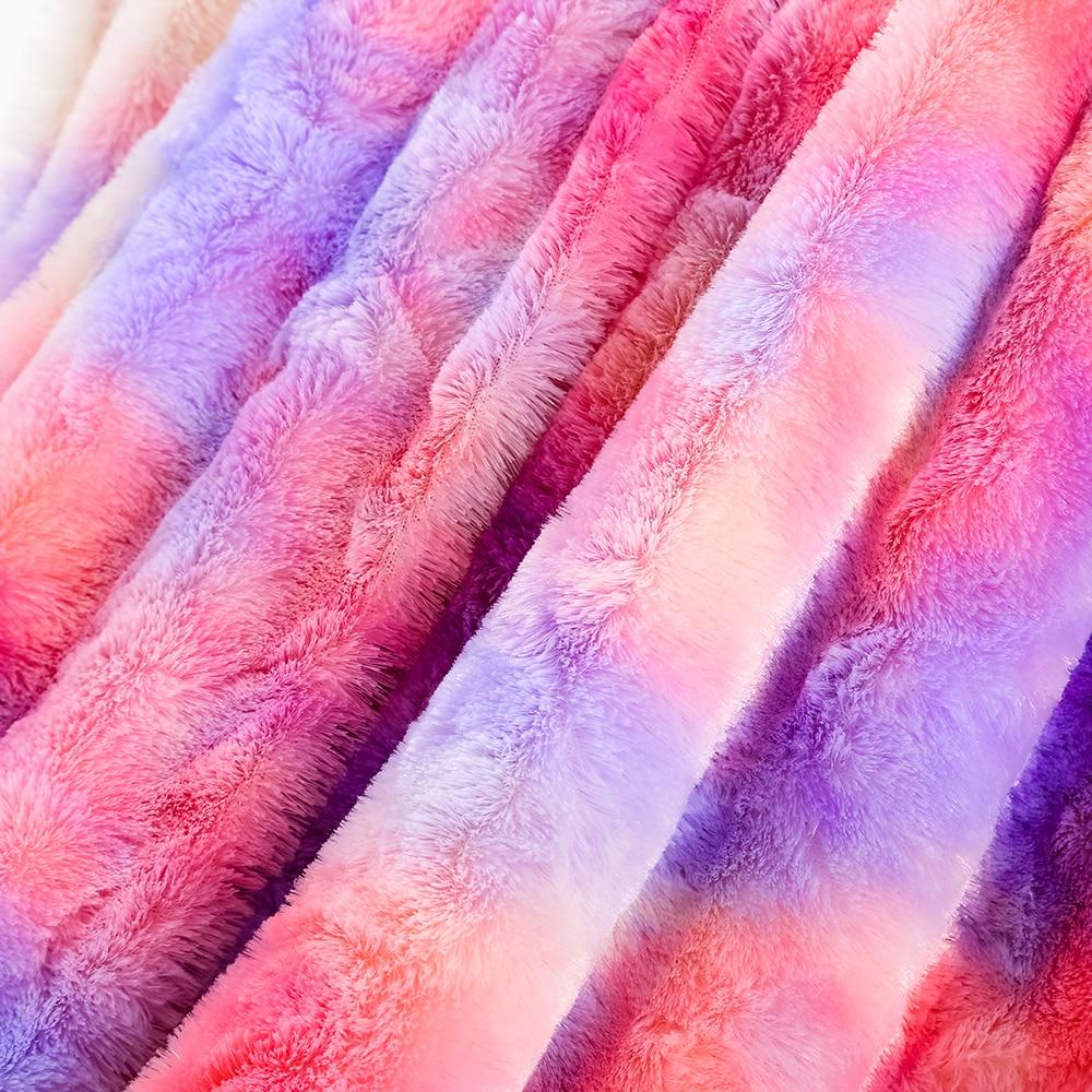 Gorgeously Soft And Snuggly Faux Fur Rainbow Blanket Designed With Beautiful Shades Of Purple Pink And Orange. So Cuddly And Fluffy And Colourful! Made Of Polyester. Individually Dyed So Each Blanket's Colouring Is Unique. Great As A Throw As An Extra Layer Of Warmth On Your Bed Or As A Couch Snuggle Blanket!