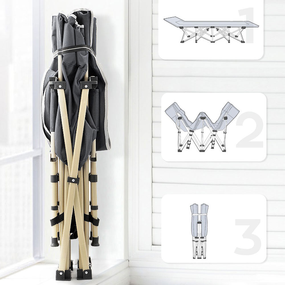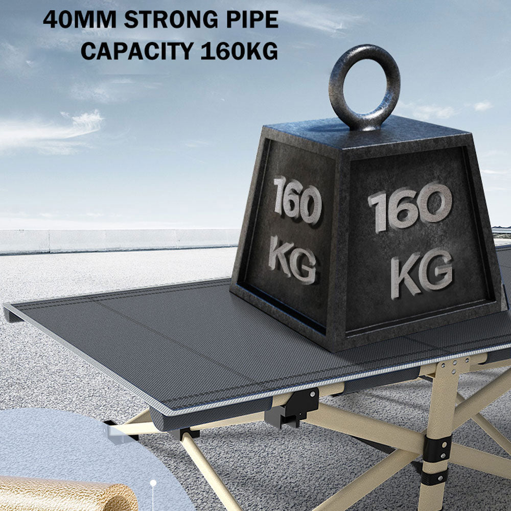 Description Whether You're Camping At The Beach Outdoors Or Poolside You Need A Place Where You Can Relax Comfortably And Enjoy The Heat Of The Sun. Something That You Can Lay Back On While Sunbathing Or Place Under A Tree For A Quick Nap And Relaxation. The Outdoor Camping Stretcher Bed Is A Stylish And Durable Lounge Bed That Will Meet Your Needs. Whether You Position It By The Pool Or Anywhere Around Your Home The Modern Design Of This Folding Bed Brings A Sense Of Relaxation And Beauty To Any Space. The Structure Of The Folding Bed Was Designed With Multiple Support Structures Making It Very Durable And Strong. The Steel Tube Bed Frame Adopts A Multi-Triangular Structure With A Unique Design And The Linkage Support Structure Provides Excellent Load-Bearing Capacity. The Link Axis Of Screws Is Not Easy To Deform And Features Reinforced Steel Construction That Can Support Weight Up To One Hundred Sixty Kilograms. The Folding Design Is Also Very Convenient For Saving Storage Space Ideal For Your Camping Adventures Or Beach Travels. It Can Also Transform Any Room Into A Stable And Comfortable Bedroom Suitable For Guests And Visitors Who Wish To Spend A Night At Your Home. The Folding Bed Is Made With Breathable Durable Fabric Featuring Double Stitching Which Not Only Increases Strength But Also Retains Moderate Flexibility. It Is Designed With An Eighteen-Degree Warped Head Decompression Feature That Perfectly Fits The Body Curve So You Can Sleep Peacefully Even Without A Pillow. It Saves Space And Is Convenient To Carry. You Can Open It Easily In Just One Second. This Folding Bed Is Ideal For Outdoor Beach Travel Sports Events Picnics Camping Or Any Location Where You Want To Go And Relax.Strong>Feature