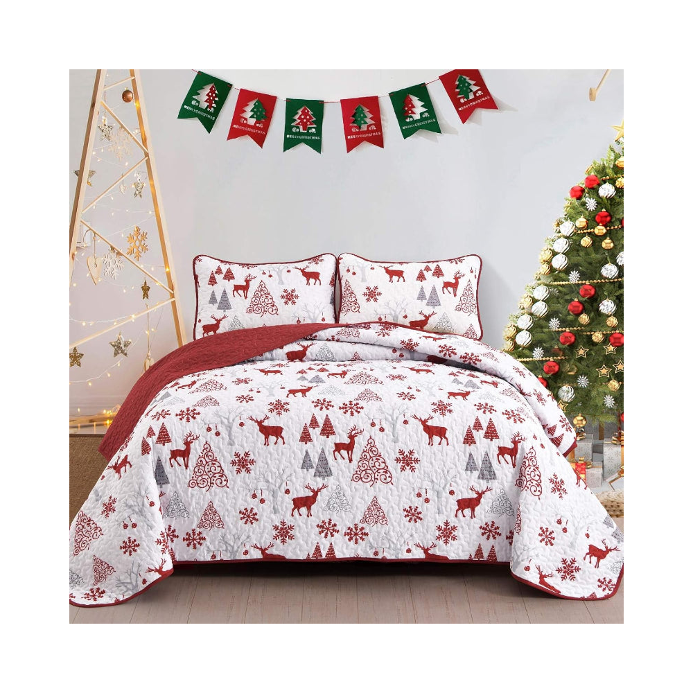 Christmas 3-Piece Quilt Bedspread Set – Queen SizeBring Festive Charm To Your Bedroom With This Queen Size Christmas Quilt Bedspread Set. Featuring Cheerful Santa Claus Reindeer Snowman And Snowflake Designs This Reversible Coverlet Creates A Cozy And Magical Holiday Atmosphere. Specifications: