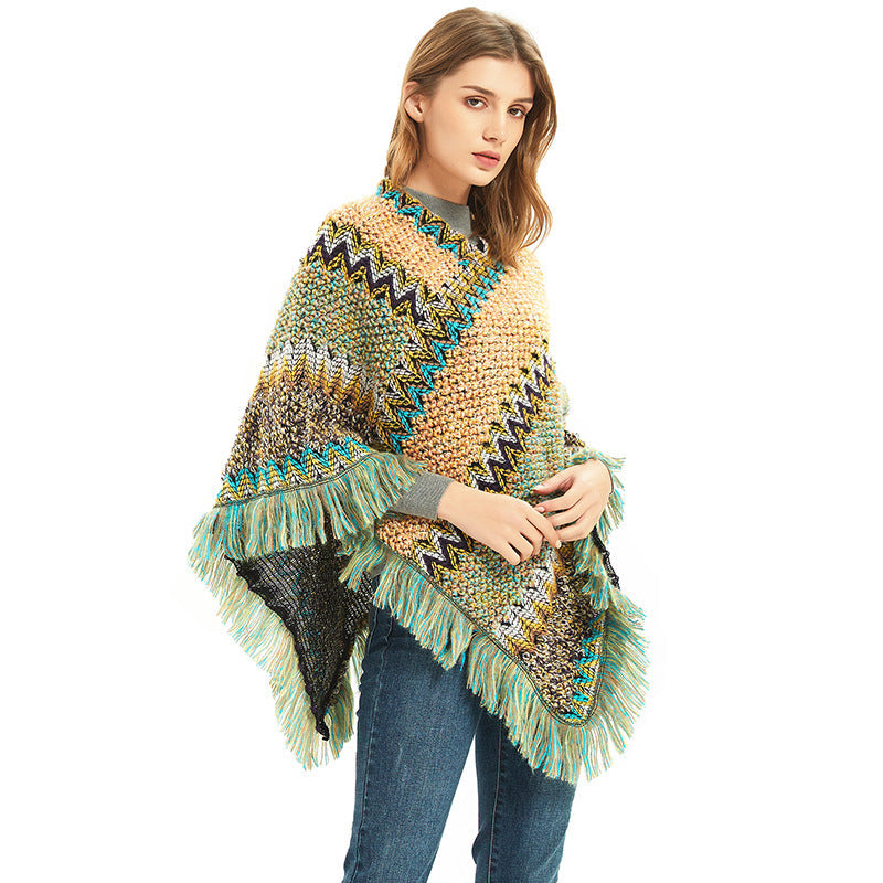 Boho Chic: Colorful Knit Poncho With Chevron Fringe