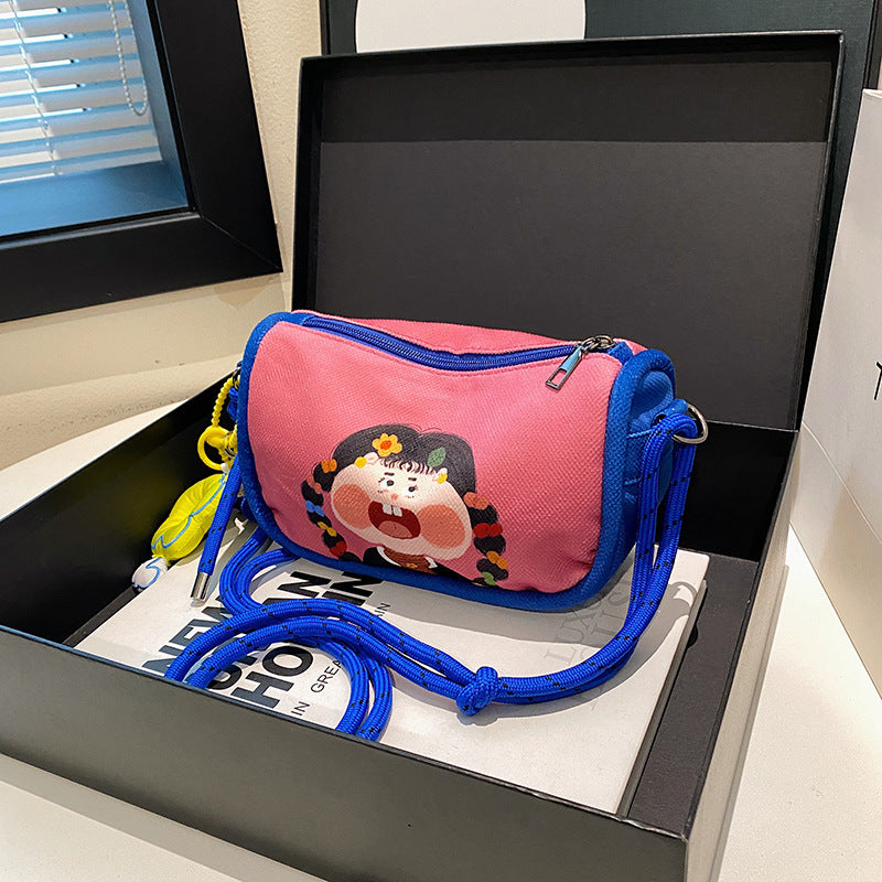 Whimsical Cartoon Girl Crossbody Bag - Lightweight Canvas With Rope Strap Flower Charm