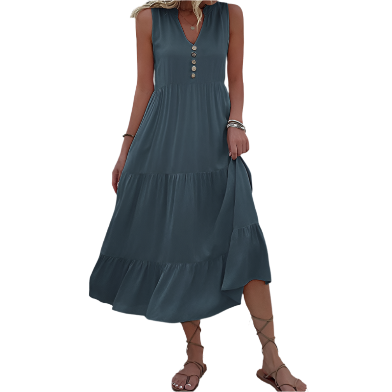 Elevate Your Summer Wardrobe With This Effortlessly Chic Flowy Sleeveless Midi Dress. Crafted With Lightweight Breathable Fabric And Designed To Create A Flattering Silhouette This Dress Is Perfect For Sunny Days Casual Outings And Relaxed Evenings. The Elegant Decorative Buttons And Tiered Skirt Add A Stylish Bohemian Charm Making It A Must-Have For Every Free Spirit.