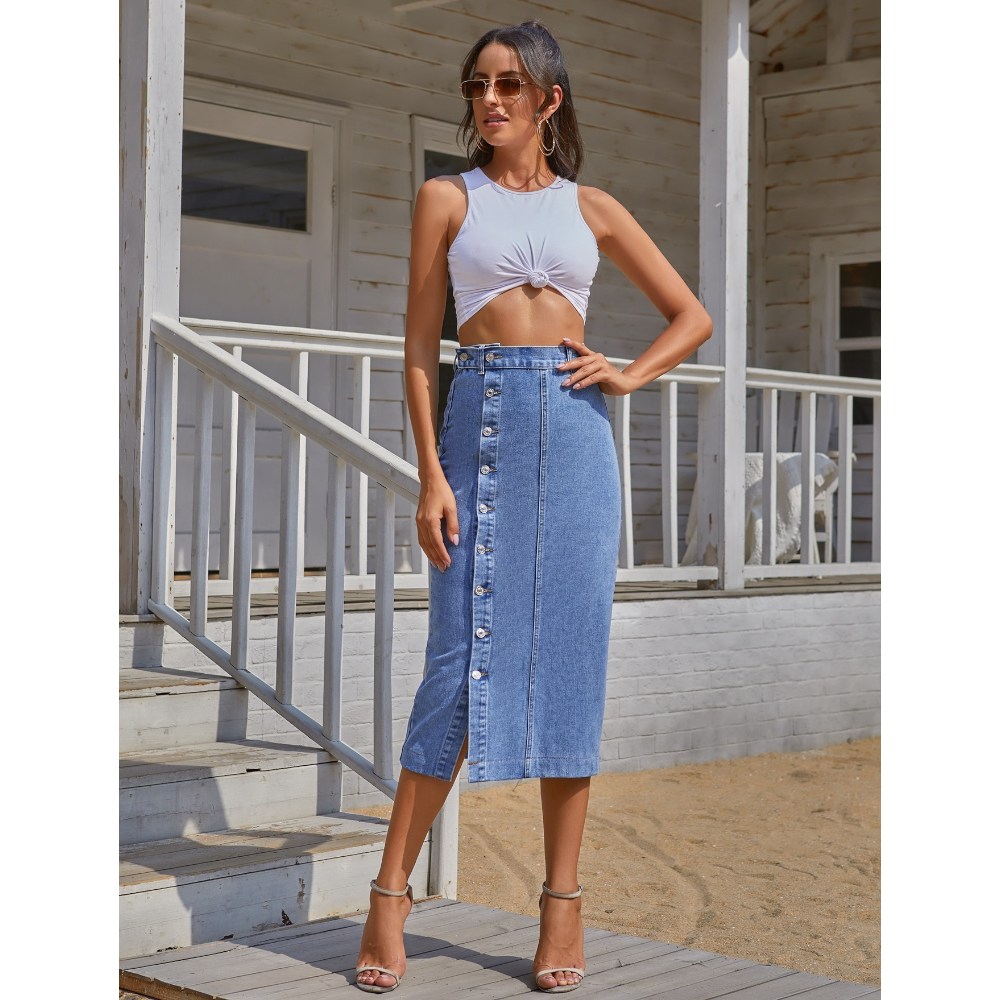 Button Irregular Slit Denim High Waist Skirt A Line Long For Women Skirts