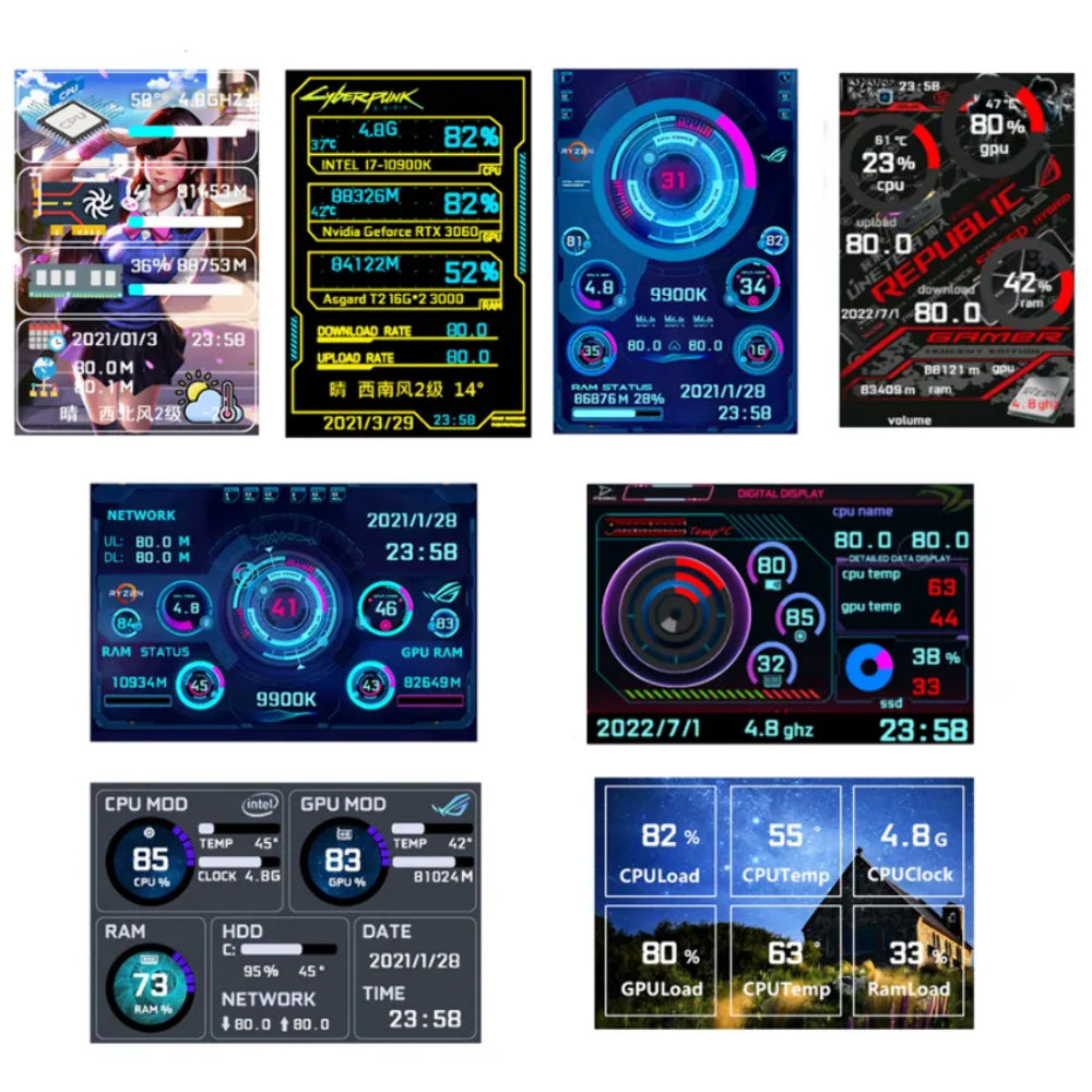 | Data Monitoring: This PC CPU data monitor supports real-time data monitoring of CPU temperature basic frequency network upload speed and download speed HDD temperature space usage rate RAM usage rate GPU temperature utilization rate etc. | |