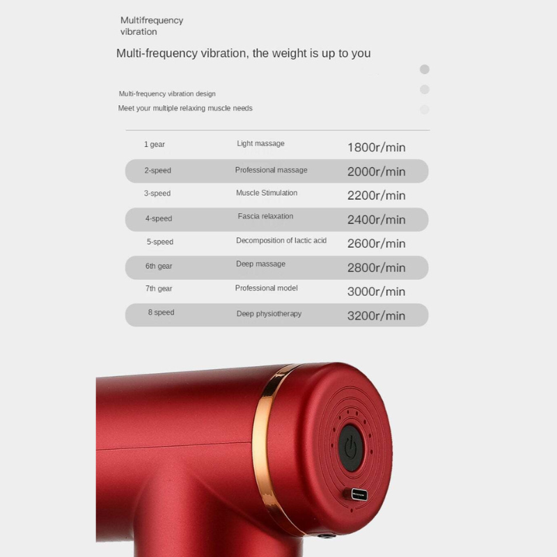 - Mini USB Deep Tissue Massage Gun - Color: Green Black Gray Red - Battery Parameters: 2400mAh Li-ion Battery - Battery Life: 50000 hours - Working Time: 4 hours - Charging time: 180 minutes - Rated voltage: AC110V/220V - Charge Method: Charged by USB Cable (Type C)OUR GUARANTEE: