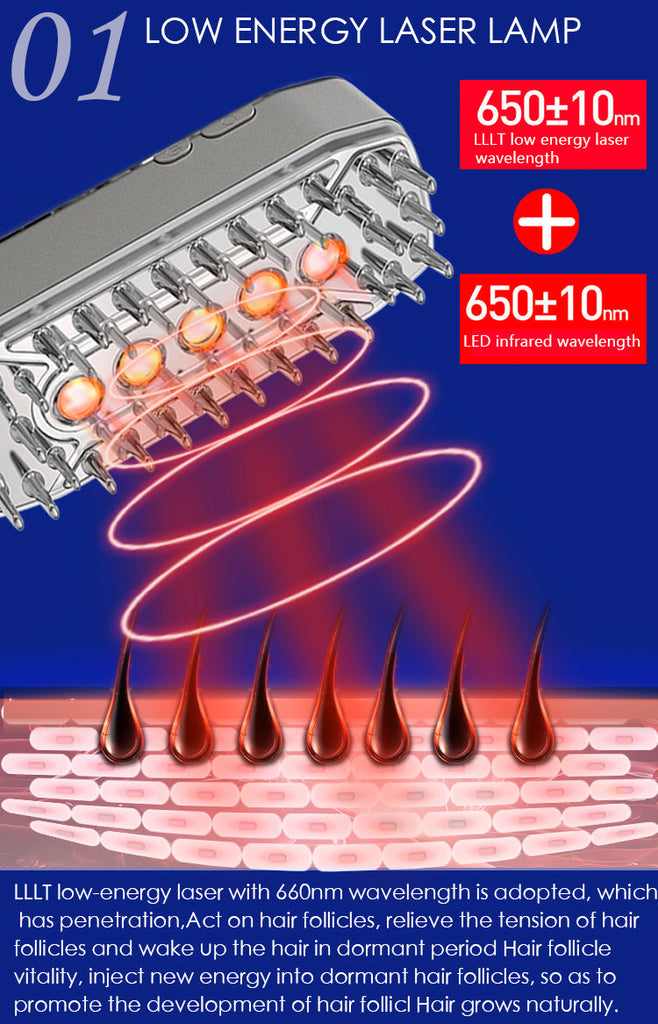 • Low-Energy laser: 650±10Nm laser And Red Light Stimulate Hair Follicles Relieve Scalp Tension And Promote Hair Growth.