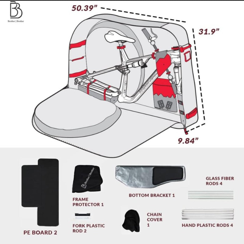 The set includes the bike travel bag with inner dimensions of 49.6 x 31.1 x 9.45 inches and outer dimensions of 50.39 x 31.5 x 9.84 inches along with: