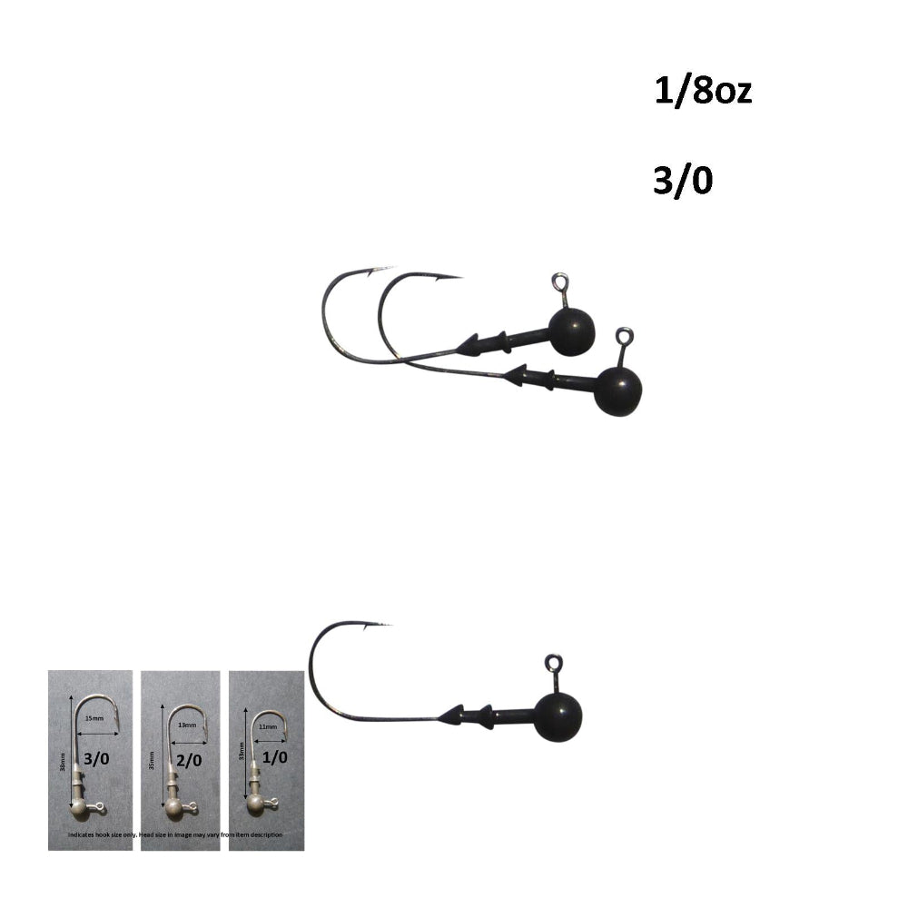 Weights Should Be Selected According To The Depth Of Water Wind Current And The Size And Shape Of The Soft Plastic. As A General Guide 1/8 To 1/6Oz Jig-Heads Are Ideal For Prospecting Shallow Ground. Moving Into Say 10 To 20M Of Water 1/4 To 3/8Oz Weighted Jig-Heads Should Get A Plastic Down Deep Enough In Most Conditions. As Far As Hook Sizes Are Concerned There Are Some Larger Hook Size Options For The 1/16Oz Weight Than Usually Available. Using Hook Sizes In The 1/0 To 3/0 Sizes Is Usually About Right Depending On The Pattern And The Size Of The Soft Plastic.