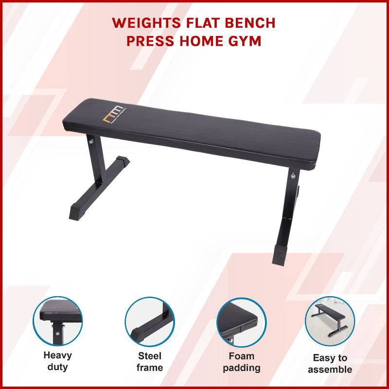 - 1 x Home gym flat bench (minor assembly required)