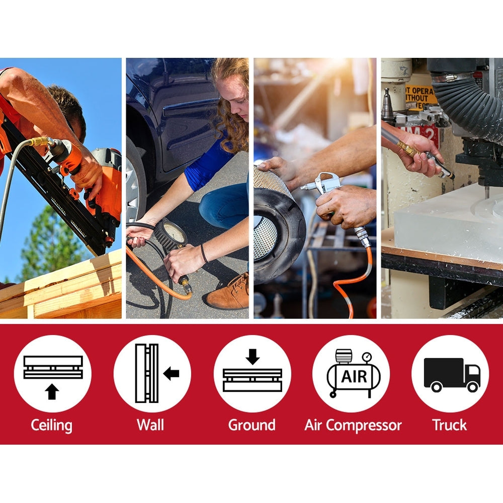 If you are looking for a long and retractable air hose reel for your home or commercial workshop then consider the GIANTZ Wall Mounted Retractable Air Hose Reel. With a 20m or 10m hose (depending on model) that offers you unbridled movement around your workshop from one connection point the retractable air hose reel comprised a UV-resistant PVC hose with premium stainless steel A¼ #34; BSPT AU quick-connect fittings. Linking the hose to a compressor is easy via the hose that connects to the side of the unit. The spring-loaded hose utilises an incremental feed lock that allows the extended hose to stay put at its place. And after the work is done just give a hose a firm tug to activate its auto rewind function. As it rewinds its self-layering mechanism will ensure that the winding is done neatly and evenly within the casing. The air hose reel can be swivelled 180A° when mounted on the wall to allow easy hose movement around corners. If required the entire unit can be removed by slotting out the quick-release hinge rod and secured with the same at another location within the workplace. Other handy features include a rear hose holster that provides a safe and tidy connection between the compressor and reel an internal access hatch located at the top of the casing and a swivel carry handle.