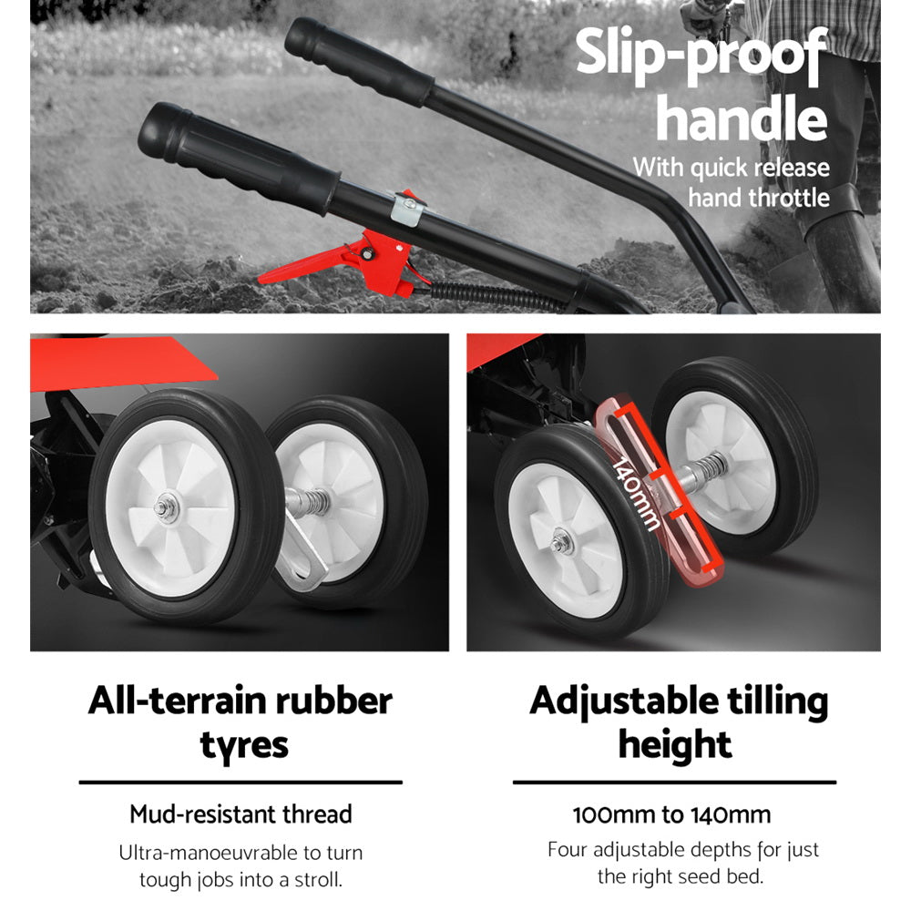Get The Earth Moving Quick And Easy With The Giantz Hand-Held Tiller. Featuring A 88Cc 10000Rpm 2-Stroke Petrol Motor The Tiller Churns Out Soil Deep And Wide With Its 16 Teeth Of Hardened Steel Tines. The Four Blades Allows You To Till An Extra-Wide Swath Of 400Mm And Up To 150Mm In Depth In Only One Third Of The Time Compared To Four-Blade Models. In Other Words You Only Need One Pass With The Tiller To Pulverise The Soil And Get The Right Seedbed For Your Favourite Crops. Operating The Tiller Is Just As Easy With Its Pull-Start Improved Engine Steady Handle And Quick-Release Hand Throttle Control And All-Terrain Rubber Tyres To Transform Back-Breaking Tilling Work Into A Ground-Breaking Stroll. And When The Tilling Is Done Just Fold Away The Tiller And Store With The Rest Of Your Tools. Ideal For The Home Gardener Or Small-Scale Commercial Grower.