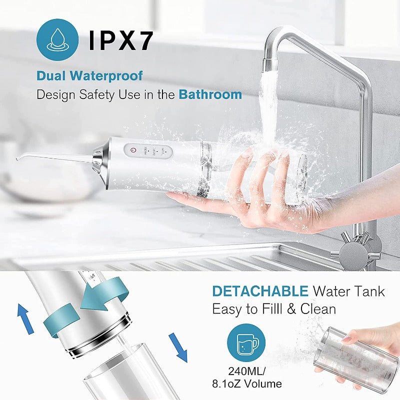 - {IPX7 Waterproof Design}The whole machine adopts IPX7 waterproof design inside and outside allowing water flosser to be used in the bathroom.