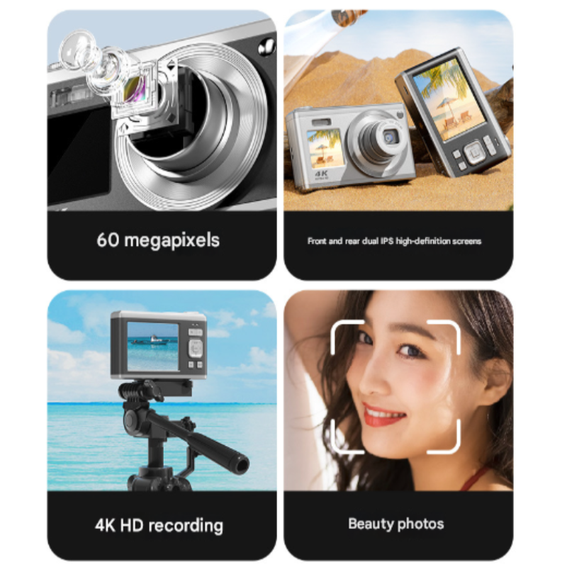 Silver 4K Ultra Hd Digital Camera With 10X Optical Zoom Compact Dual Screen Vlogging Digital Cameras