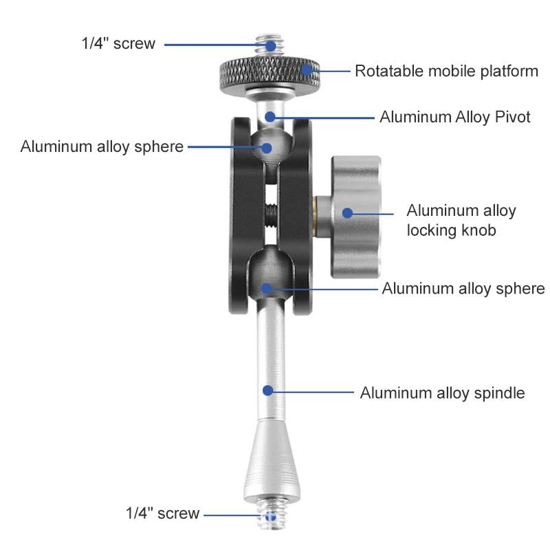 Li>Constructed From Durable And Corrosion-Resistant Aluminium Alloy. Li> Magic Arm Mounting Accessories With Two Ball Heads For Versatile Positioning. Li>Compact Butterfly Clip Design Facilitates Easy Handling And 360-Degree Rotation Without Any Dead Angles. Li>Double-Headed One-Quarter Inch Screw With A Locking Knob Ensures Secure And Quick Operation. Li>Designed To Provide A Comfortable Shooting Environment.