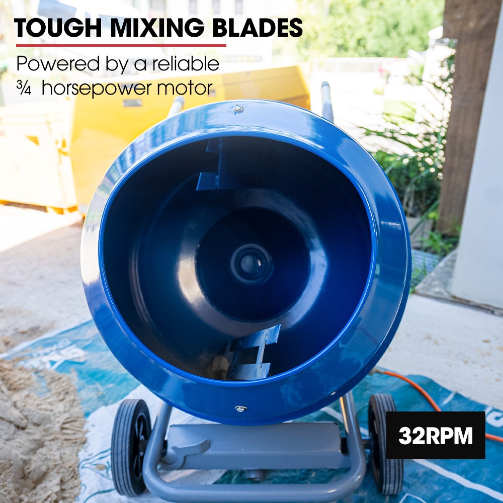 The Powder-Coated Steel Drum And Sturdy Steel Frame Offer Long-Lasting Durability. The Pedestal Stand Allows For Easy Pouring Into Raised Forms Or Wheelbarrows. Equipped With 10-Inch Rubber Wheels It Glides Smoothly Over Rough Terrain While A Protective Motor Cover Shields Critical Components From Spills.
