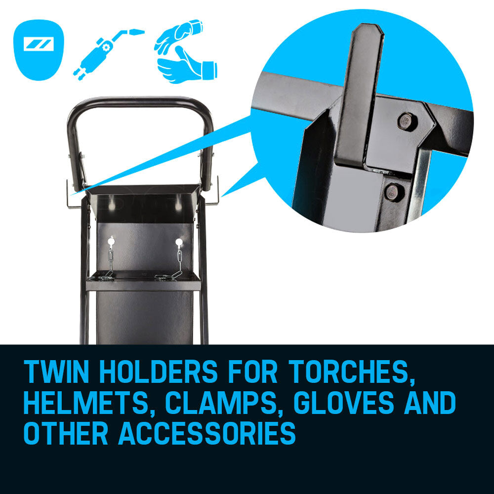 Featuring an angled top shelf for optimal access to welder controls the Rossi Deluxe offers all you need to keep things tidy and streamlined for your MIG TIG SMAW FCAW or plasma setup. So order your Rossi Deluxe welding cart today and put the spark back into work again!