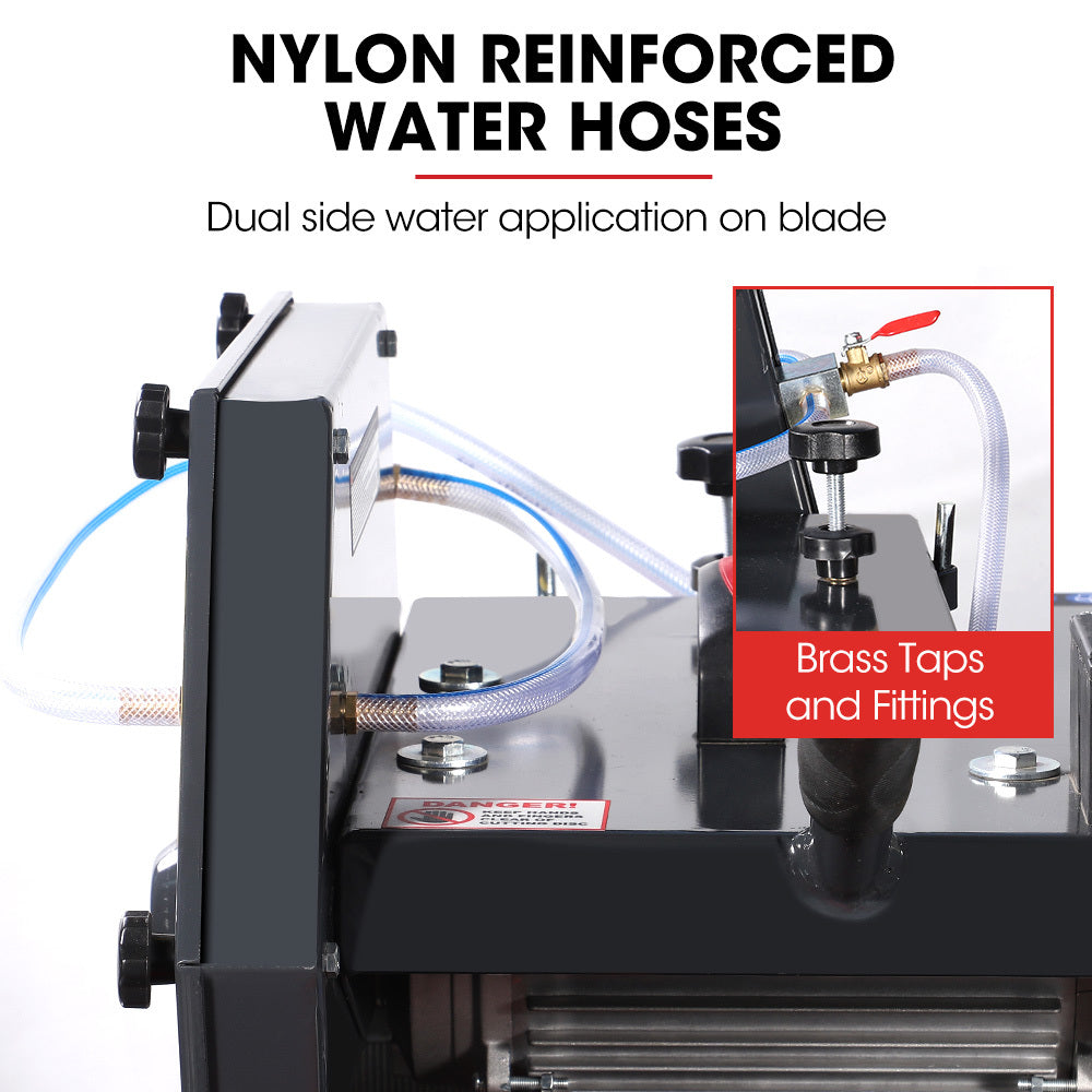 At Its Core The Bbs450 Boasts A Potent 2200W Motor Mounted On A Spring Loader Armature Ensuring Smooth And Precise Cutting. The Rail Effortlessly Pivots For Bevel Cuts While The Wet-Cutting System Is Fueled By A Reliable High-Volume Pump In The Undertray Reservoir Featuring A Shielded Water Pipe For Durability Against Typical Knocks.