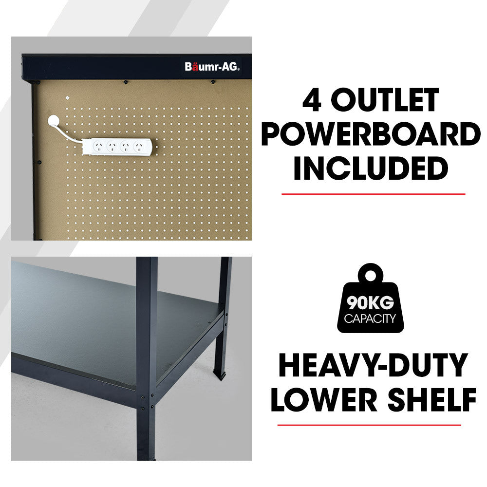 P>Spanning The Entire 120Cm Product Width Is A Large Pegboard On Which You Can Neatly Organise Your Hand Tools. Side-By-Side Under Counter Drawers Are Perfect For Storing Consumables And Protecting Items From Dust. The Generously Sized Enamel Coated Particle Benchtop Provides The Durability Needed For Most Of Your Diy Woodworking Projects. P>The Baumr-Ag Multi-Purpose Work Bench Has An Integrated Led Worklight For Optimal Visibility In Any Room. It Also Comes Complete With A Four Socket 10 Amp Power Board That You Can Attach Wherever You Like On The Pegboard. Charging And Powering Your Tools And Accessories Now Couldna€™T Be Easiera€”Making The Baumr-Ag Work Bench A Great All-Arounder For Any Home Garage Or Workshop.Ul> Li>250Kg Total Load Capacity Li>Corrosion Resistant Enamel Coating Li>Pegboard Tools And Accessories Storage Li>Integrated Benchtop Led Lighting Li>2 Pull-Out Drawers Li>4 Socket Power Board Included Li>Rubber Feet For Extra Stability/Ul>Specification