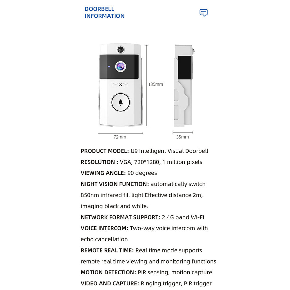 U9 Visual Doorbell Hd Wireless Video With Long Lasting Battery Smart Doorbells