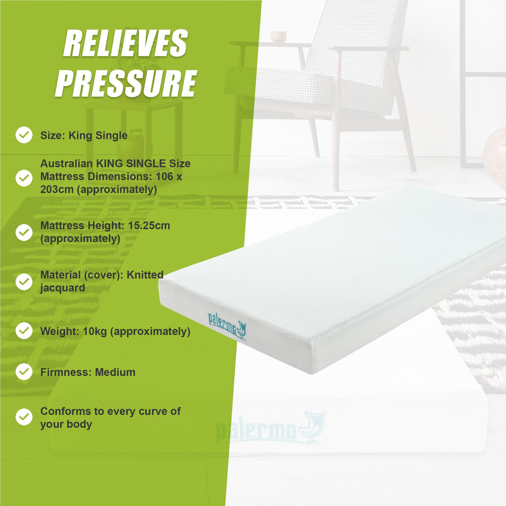 You'll Feel Like A Queen Or King With Palermo's Comfy Memory Foam King-Single Mattress. With Six Inches Of Body-Conforming Memory Foam You'll Think Your Bed Was Custom Made For Your Exact Dimensions. The Magic Comes In The Memory Foam. Super-Sensitive To Changes In Temperature The Foam Gives As It Senses The Head Of Your Body Allowing It To Mould To Every Curve. Its Full-Support High-Density Foam Base Layer Makes This Mattress Extraordinarily Durable Making Your Custom Comfort Last For Years. The Foam Bears TheCertipur Us Seal Of Approval Assuring You Of Its Durability Quality Performance And Low Indoor Emissions.