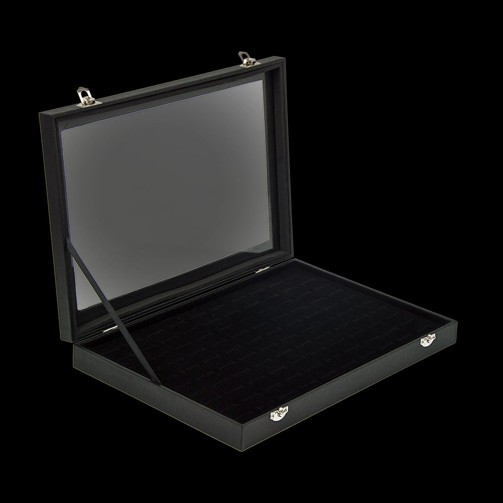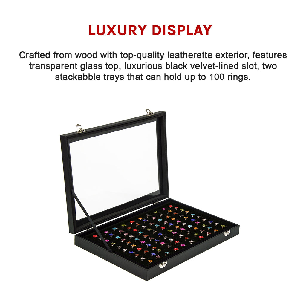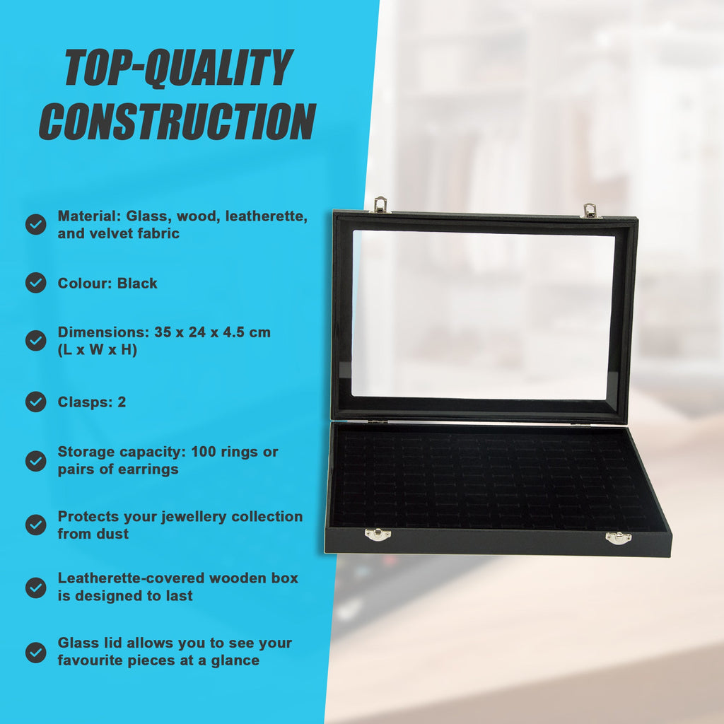 Keep Your Jewellery Perfectly Organised And Elegantly Displayed With This Luxurious 100-Slot Earring And Ring Holder. Whether You're A Collector Retailer Or Simply Love A Tidy Vanity This Sleek Black Display Case Offers A Stunning Way To Protect And Showcase Your Favourite Pieces. With Its Soft Velvet Lining And Transparent Glass Lid Your Rings And Earrings Stay Visible Secure And Dust-Free — Making Accessorising Effortless Every Day.