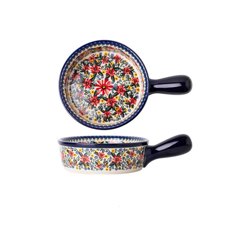 • Round baking bowl with handle: 16.3cm diameter with 7.5cm long handle 5cm deep
