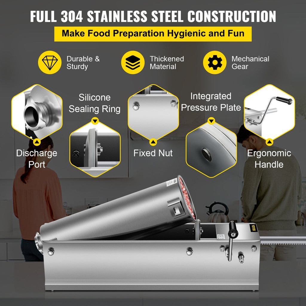 Vevor Manual Sausage Stuffer 7 L / 15 Lbs Horizontal Machine Dual Speed Meat Made Of Food Grade 304 Stainless Steel Includes Stuffing Tubes For Home K