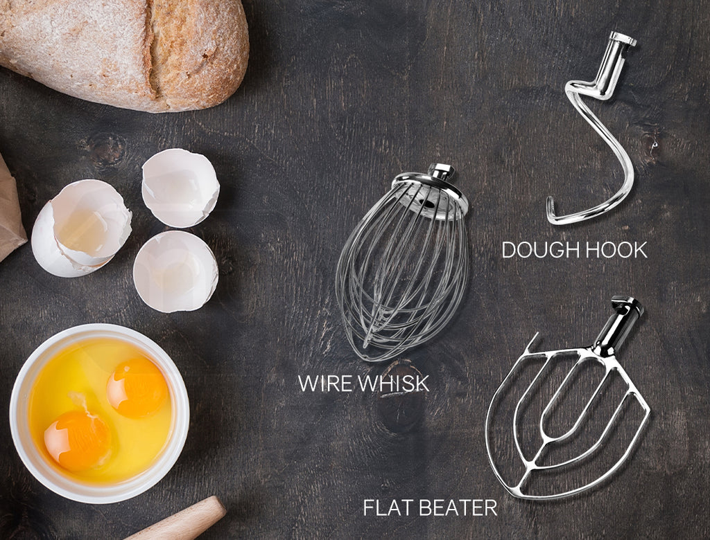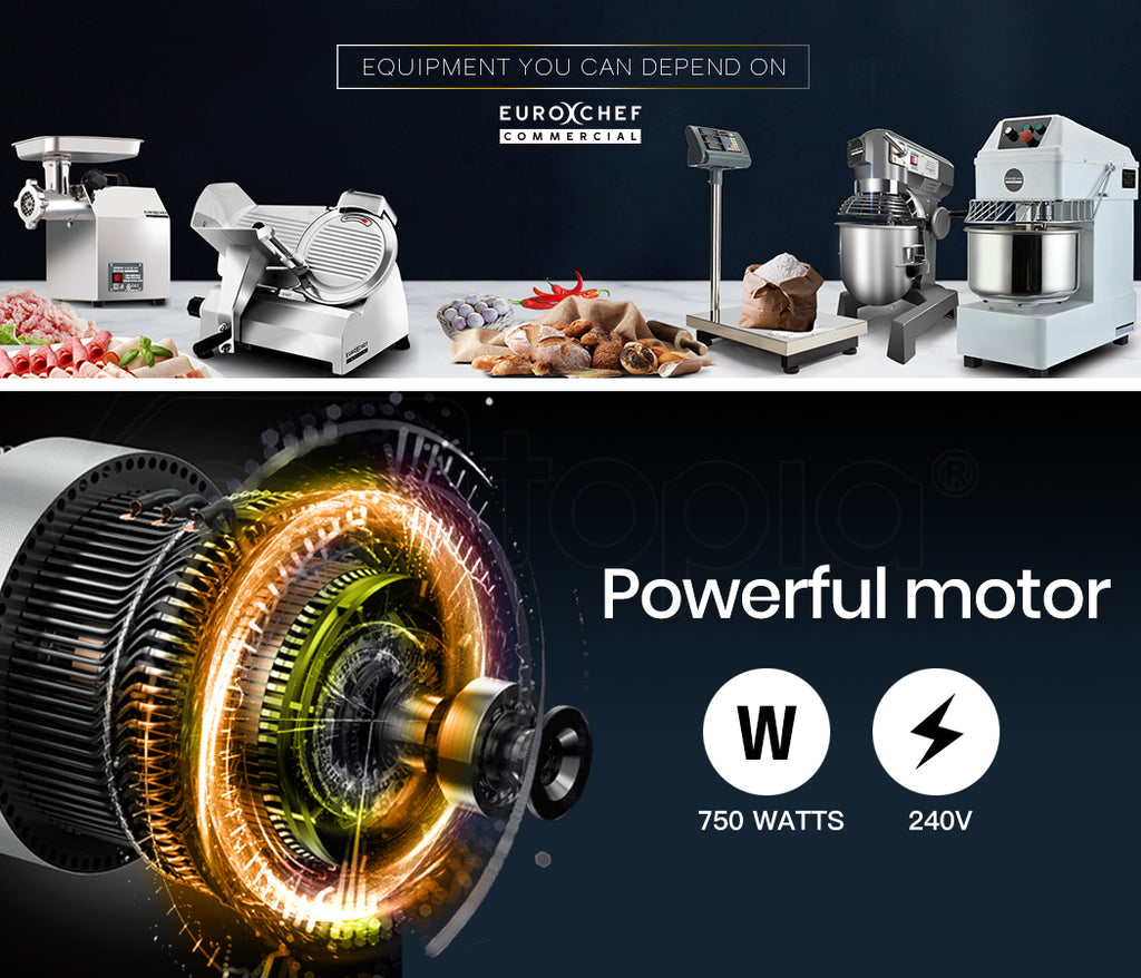 The wire whisk spiral dough hook and flat beater can each be conveniently attached and removed easily in seconds. These stainless steel attachments along with the bowl exceed food industry standards worldwide. A full metal body design offers both stability and effortless cleaning while the protective guard provides peace of mind. The EuroChef Commercial range is offered direct to the public at wholesale prices making this stand mixer a smart investment for savvy owners of restaurants pizzerias and school canteens.