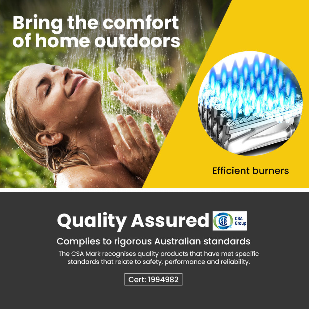 Operation Is Also A Breeze Thanks To A Seasonal Control Setting And Automatic Ignition Which Ignites The Burner As Soon As Water Flows. You Can Even Select A Desired Flow Setting On The Premium Shower Head Ranging From A Light Rainfall Up To An Invigorated Massage Like Pressure! When Water Flow Is Switched Off At The Trigger Head The Unit Automatically Shuts Down.