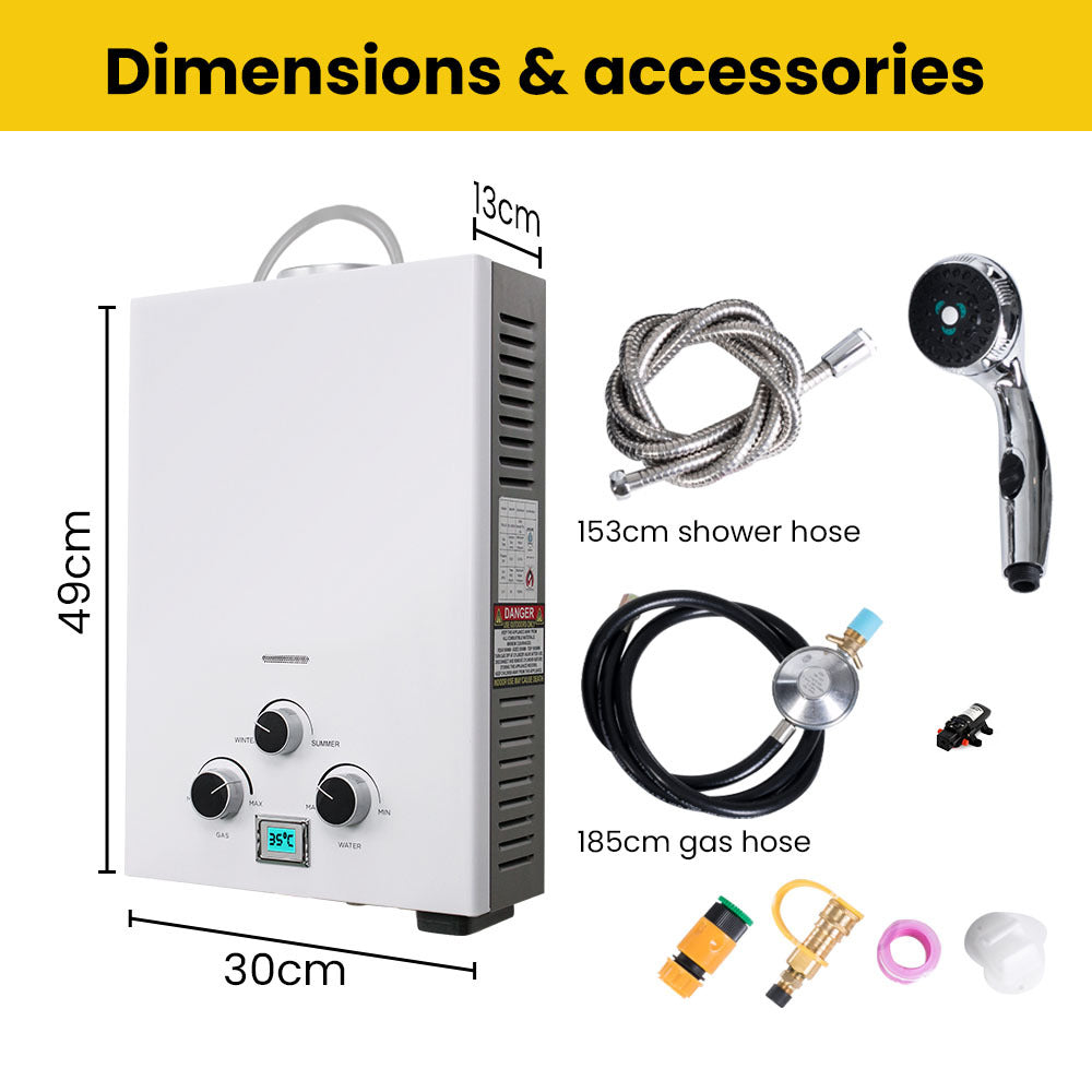 Thermomate Gas Outdoor Camping Hot Water Heater System With 12V Pump Shower Head White Water Heaters