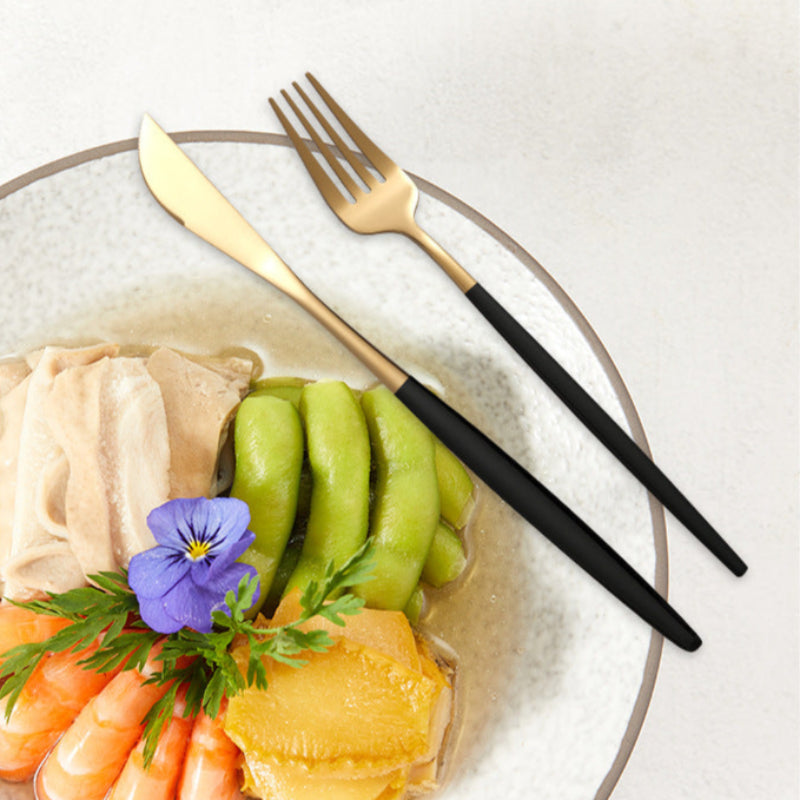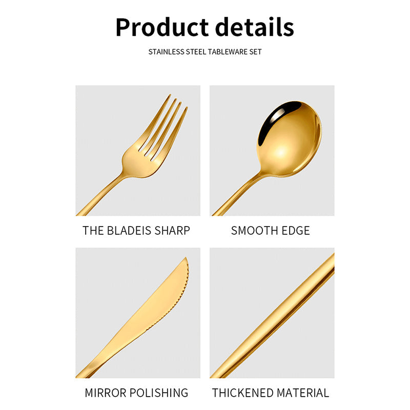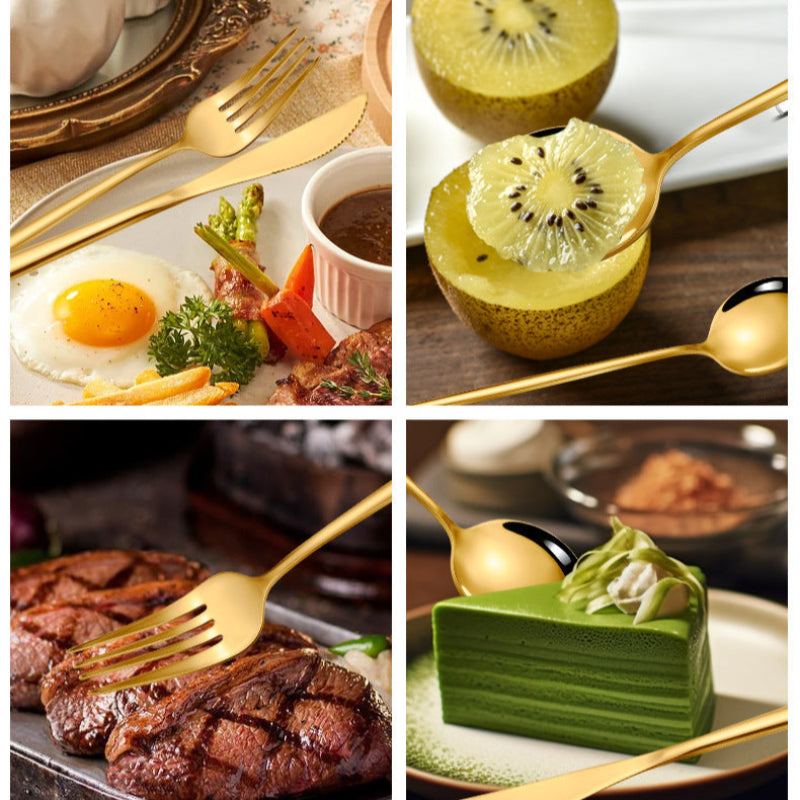 Enhance Your Dining Experience With This Luxury 24-Piece Stainless Steel Cutlery Set. Designed With Elegance And Practicality In Mind This Set Features Gold-Accented Steak Knives Forks And Spoons Perfect For Sophisticated Dining Or As A Thoughtful Gift.