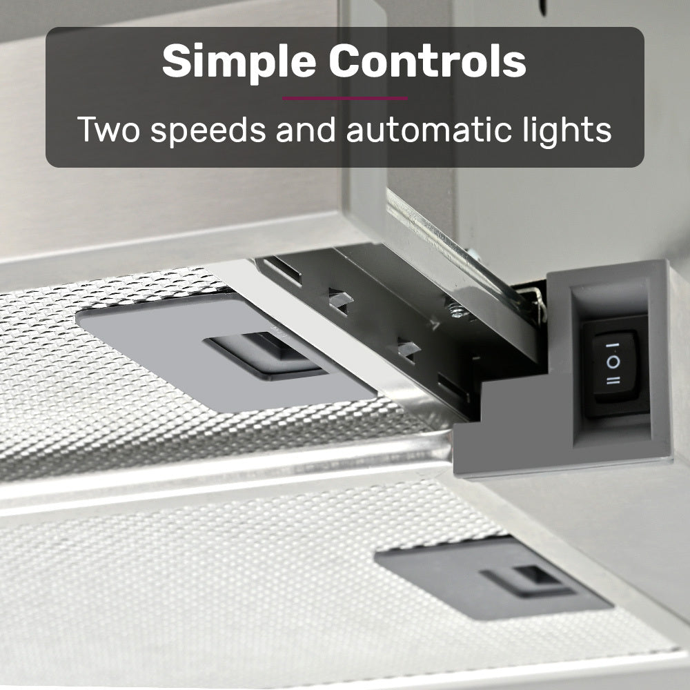 The Eurochef Slideout Rangehood Offers Sleek Space-Saving Functionality Paired With Powerful Performance. Its Durable #430 Stainless Steel Construction Houses A 126W Motor Providing Up To 330M³/H Of Airflow To Efficiently Clear Smoke And Odours From Your Kitchen.