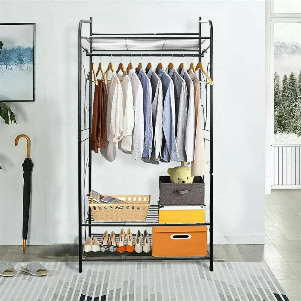 Black Metal Heavy Duty Clothes Rail Rack With 2 Shelf Storage Shelves Garment Racks