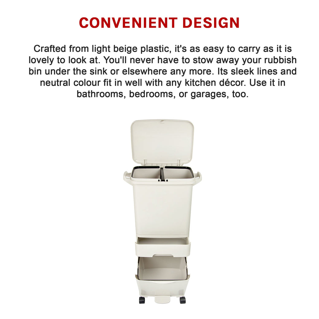 P Style="Text-Align:Start">Crafted From Light Beige plastic It's As Easy To Carry As It Is Lovely To Look At. You'll Never Have To Stow Away Your Rubbish Bin Under The Sink Or Elsewhere Any More. Its Sleek Lines And Neutral Colour Fit In Well With Any Kitchen D©Cor. Use It In Bathrooms Bedrooms Or Garages Too. Its Versatility Makes It An Ideal Fit For Practically Any Space Where You Need To Store Your Rubbish. A Lid Lock Keeps Odours From Getting Out And Pests From Getting In. It's Truly A One-Stop Solution For All Your Disposables. Order Yours TodayP Style="Text-Align:Start">Features And Specifications:Ul>Li Style="Text-Align:Start">Material: plasticLi Style="Text-Align:Start">Colour: Light BeigeLi Style="Text-Align:Start">Number Of Main Compartments: 2Li Style="Text-Align:Start">Number Of Actual Compartments: 3Li Style="Text-Align:Start">Overall Dimensions: 42 X 28.2 X 84Cm L X W X HLi Style="Text-Align:Start">Dimensions Top Compartment: 41 X 28.2 X 32.6Cm L X W X HLi Style="Text-Align:Start">Dimensions Drawer: 33.3 X 22.5 X 7Cm L X W X HLi Style="Text-Align:Start">Wheels Turn 360 DegreesLi Style="Text-Align:Start">Locking LidLi Style="Text-Align:Start">Removable CompartmentLi Style="Text-Align:Start">Suitable For Kitchen Or Any RoomLi Style="Text-Align:Start">Sleek LinesLi Style="Text-Align:Start">Neutral Colour/Ul>