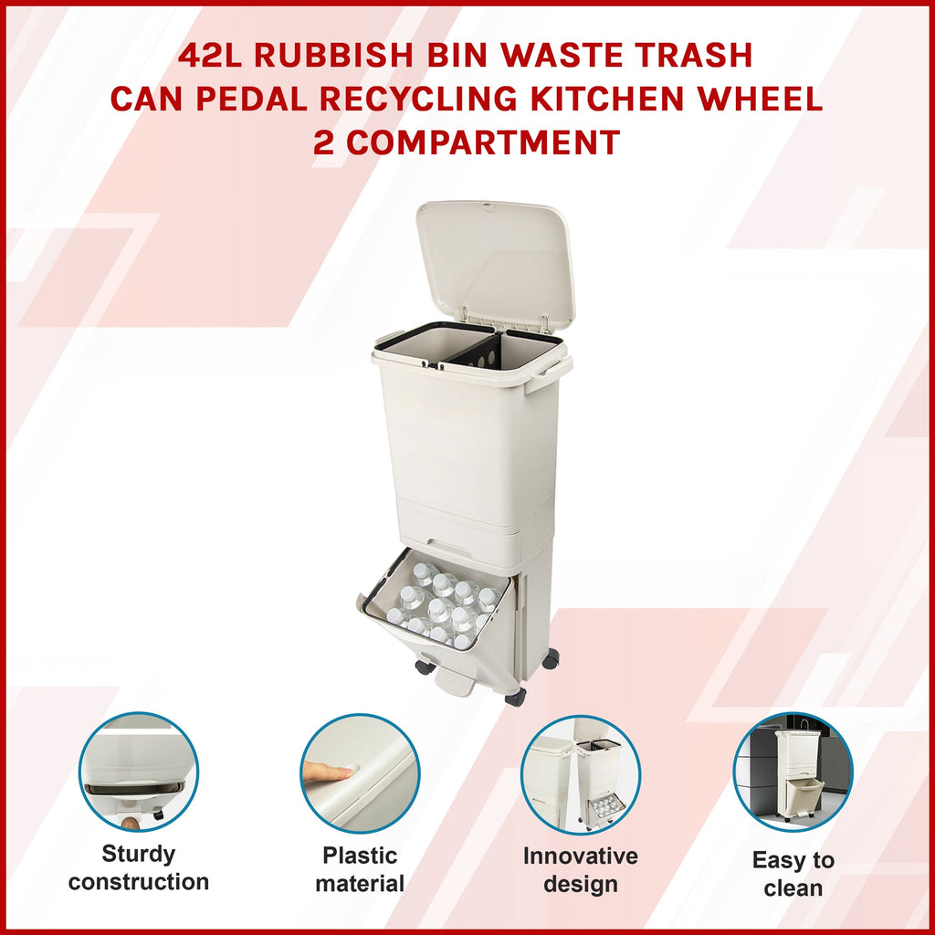 42L Rubbish Bin Waste Trash Can Pedal Recycling Kitchen Wheel Compartment Rubbish Bins