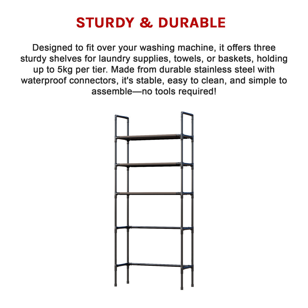 Designed To Fit Over Your Washing Machine This Unit Offers Three Sturdy Shelves For Laundry Supplies Towels Or Baskets Each Holding Up To 5Kg. Made From Durable Stainless Steel With Waterproof Connectors It's Stable Easy To Clean And Simple To Assemble—No Tools Required.