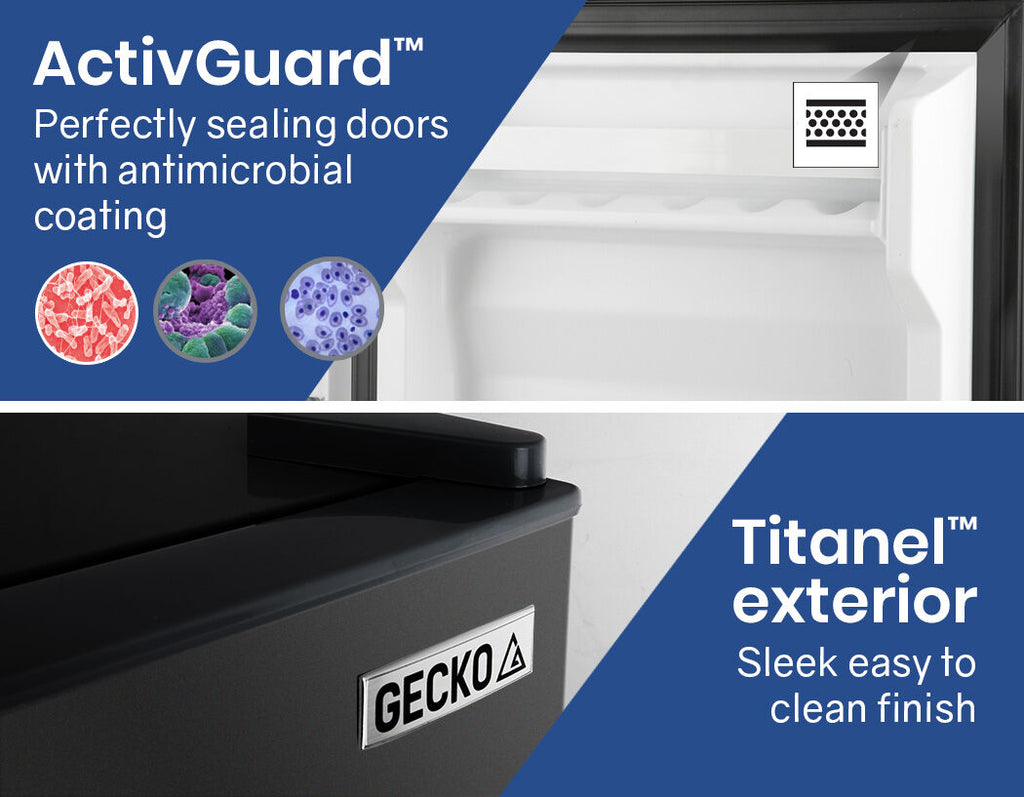 The Gecko is designed to perform in harsh Australian conditions. Latest compressor technology and thick insulation ensure that it can cool fast and continue to operate in ambient temperatures up to 38 degrees! The Gecko range feature ActivSeal technology which combines perfectly sealing doors with an anti-microbial coating to inhibit the growth of germs. All this is wrapped in a sleek Titanel metal finish ensuring it will look right at home anywhere and is also ready for your souvenir Mag - net collection!