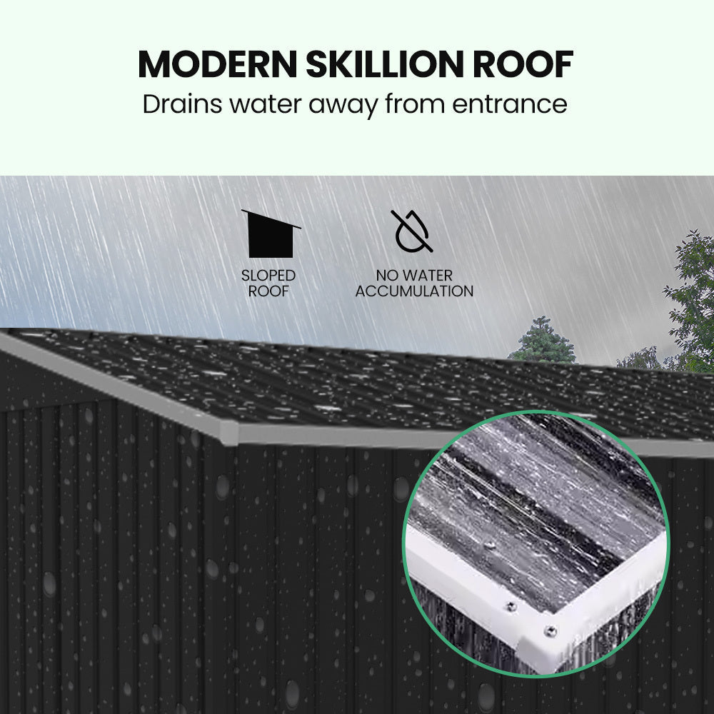 The Skillion Roof Design Effectively Channels Water Away Keeping The Entrance Dry. The Sliding Doors Offer Smooth Operation And Include Lockable Handles Providing An Option To Secure Your Belongings (Lock Not Included).