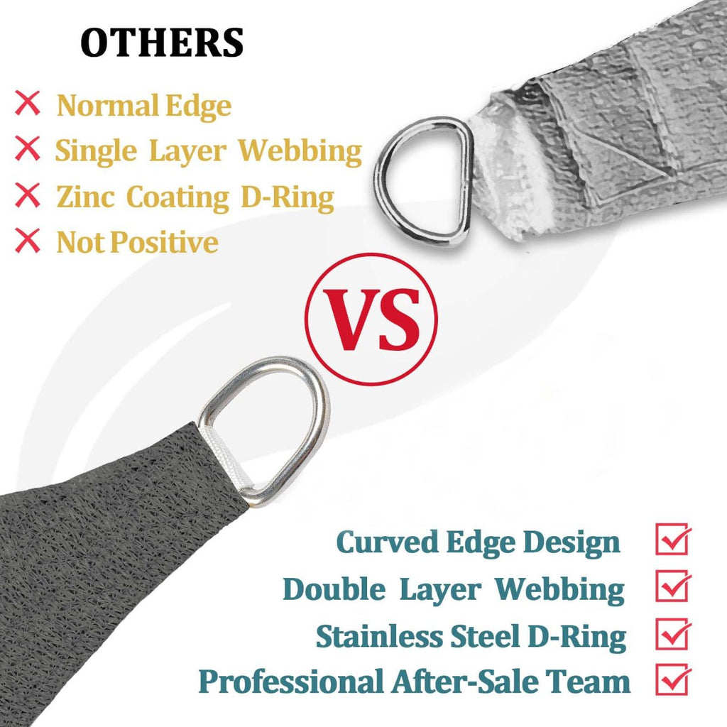 This Sun Shade Is Designed With Curved Edges To Maximum Tension; Every Corner Is Sewed With 2 Layers Of Nylon Straps Connected With Durable Stainless Steel D Ring To Avoid Rip Or Break Off.