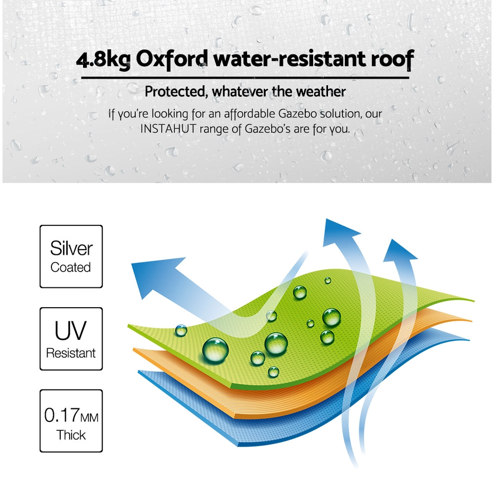 With An Extra Thick And Quick-To-Erect Powder Coated Steel Frame Equipped With Strong Legs And Struts Structure The Instahut Gazebo Is Very Simple To Set-Up And Extremely Durable. Fitted With Quick And Convenient hook-and-loop tape Attachments Easily Release/Fasten Rings And Smoothly Glide On Nylon Insert For Effortless Set Up The Instahut Gazebo Is Designed To Make Things Happen Instantly!
