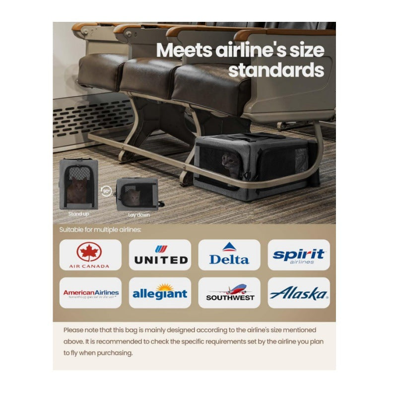 Travel With Your Furry Friend In Comfort And Style With Our Soft-Sided Pet Carrier. Designed For Small Pets This Carrier Features A Robust Built-In Steel Wire Skeleton That Prevents Collapsing Ensuring A Safe And Spacious Environment For Your Companion. The Carrier Is Equipped With Multiple Mesh Windows For Excellent Ventilation A Top Mesh Door For Easy Access And A Convenient Side Door. Thoughtful Features Include A Side Storage Bag For Snacks And Toys A Roll-Up Sunshade Curtain For Protection And A Feeding For Easy Treats. For Enhanced Safety During Car Trips It Includes An Seat Belt Loop And Zippers With A Locking Mechanism. The Carrier Is Easy To Assemble And Can Be Carried Using The Comfortable Top Handles Or The Detachable Shoulder Strap.