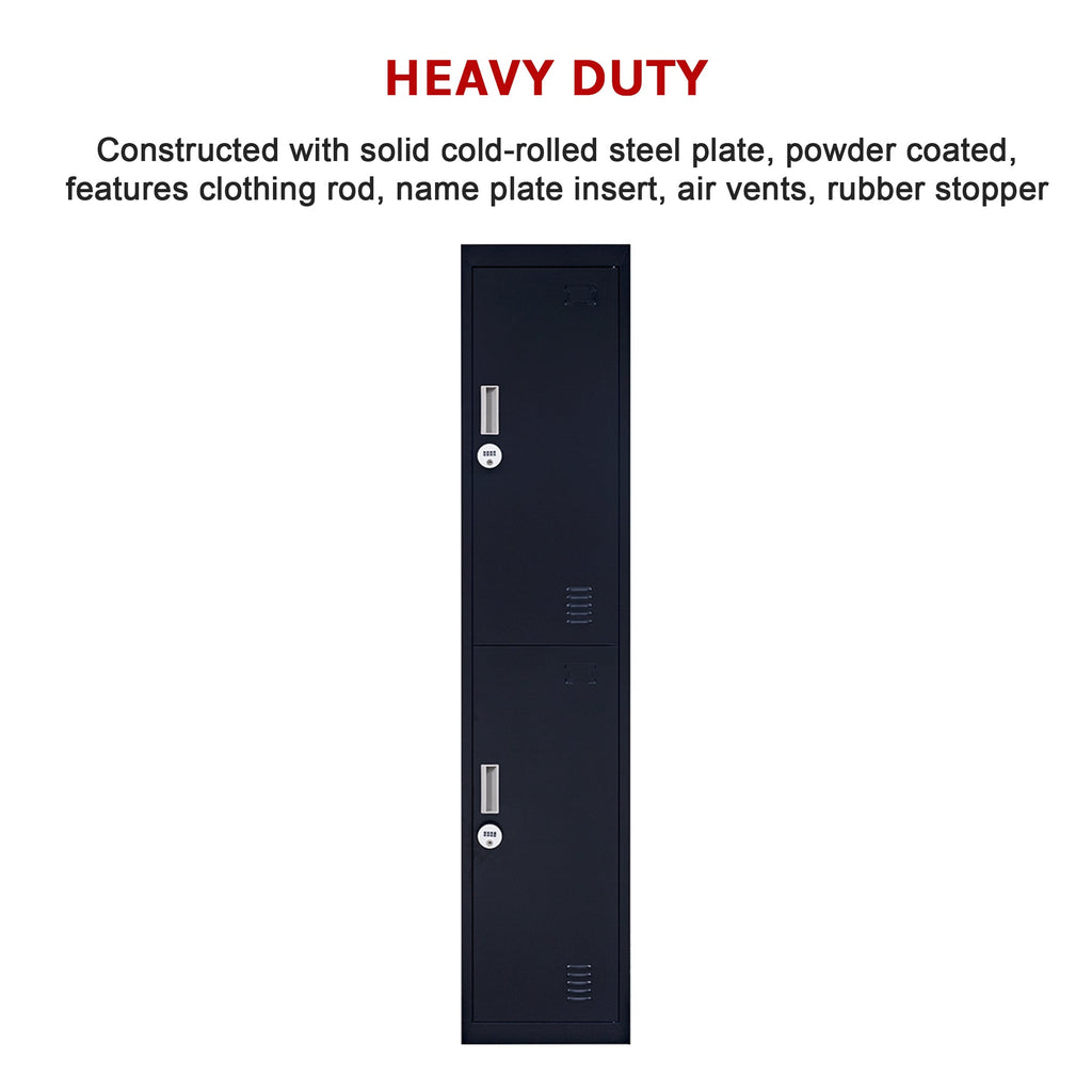 P>The Locker Is Constructed With Solid Cold-Rolled Steel Plate For Sturdiness And Durability And Comes With A 4-Digit Combination Lock For Worry-Free Storage.. The Steel Is Also Powder-Coated To Resist Corrosion. The Locker Measures 180 X 38 X 45Cm And The Maximum Recommended Weight Capacity Is Approximately 30Kg Per Locker. There Are Spaces Designated For Labels To Help Identify Lockers And Air Vents Are Built-In To Assure Sufficient Ventilation.P>For Even More Storage Consider Buying Two Or More Units Which Can Be Placed Side By Side Where You Need Them.P>A Simple Design Makes Assembly Easy And Your Locker Could Be Up And Ready In Minutes. Full Assembly Instructions Are Included.P>For A Handy Place To Store Most Anything That Won't Take Up Too Much Room Consider The 2-Door Storage Locker For You Your Employees Or Your Students.P>Features Of The 2-Door Storage Locker:Ul>Li>2 Lockers Vertically StackedLi>Colour:Strong>Black Li>Lock:Strong>4-Digit Combination Lock Li>Locker Dimensions: 180 X 38 X 45Cm H X W X DLi>Packaging Dimensions: 192 X 55.5 X 7Cm H X W X DLi>Built-In Air Vents For Locker VentilationLi>Privacy And SecurityLi>Recommended Weight Capacity: 30Kg Per LockerLi>Durable Cold-Rolled Steel Plate ConstructionLi>Powder-Coated To Resist CorrosionLi>Easy To Assemble; Instructions Included/Ul>P>Features Of 4-Digit Combination Lock:P>When Airtight Security Is A Must This Four-Digit Combination Lock By Salvatore Angelotti Is The Perfect Choice. With 10000 Different Combinations Trying To Crack The Code Will Be A Near-Impossible Task Each Order Comes With A Master Key So You Can Gain Access Even If A User Forgets The Combination. Crafted From Heavy-Duty Premium Metal This Lock Is Sturdy And Durable Making It Super Tough To Physically Crack. Moisture- And Corrosion-Resistant It's An Excellent Lock For Lockers In Locker Rooms With Water Features.P>It's The Ideal Option For Lockers In Gyms Schools Hotels Offices And Other Workplaces. Use It On Lockers In Your Garage To Secure Valuable Tools Or Even In A Wardrobe To Keep Coin Collections Jewellery Or Other Valuables Safe Inside Your Home. Simply Store The Key In A Secure Location And You'll Have Rapid Access To Items Inside The Locker If The User Leaves Or Can't Remember The Combination. Keep Your Customers' Belongings Secure.P>Note: Each Order Not Lock Comes With One Master Key Only Regardless Of How Many Different Locker Units Quantities Or Combinations Purchased. A Master Key Is Sensitive In Nature. An Additional Master Key Can Be Purchased On Special Order Only. Locker Assembly Required; Instructions And Hardware Included.P>P>Warning Children Have Died From Furniture Tipover.Ul>Li>Always Secure This Furniture With An Anchor Device.Li>Never Allow Children To Stand Climb Or Hang On Drawers Doors Or Shelves./Ul>P>Attributes: