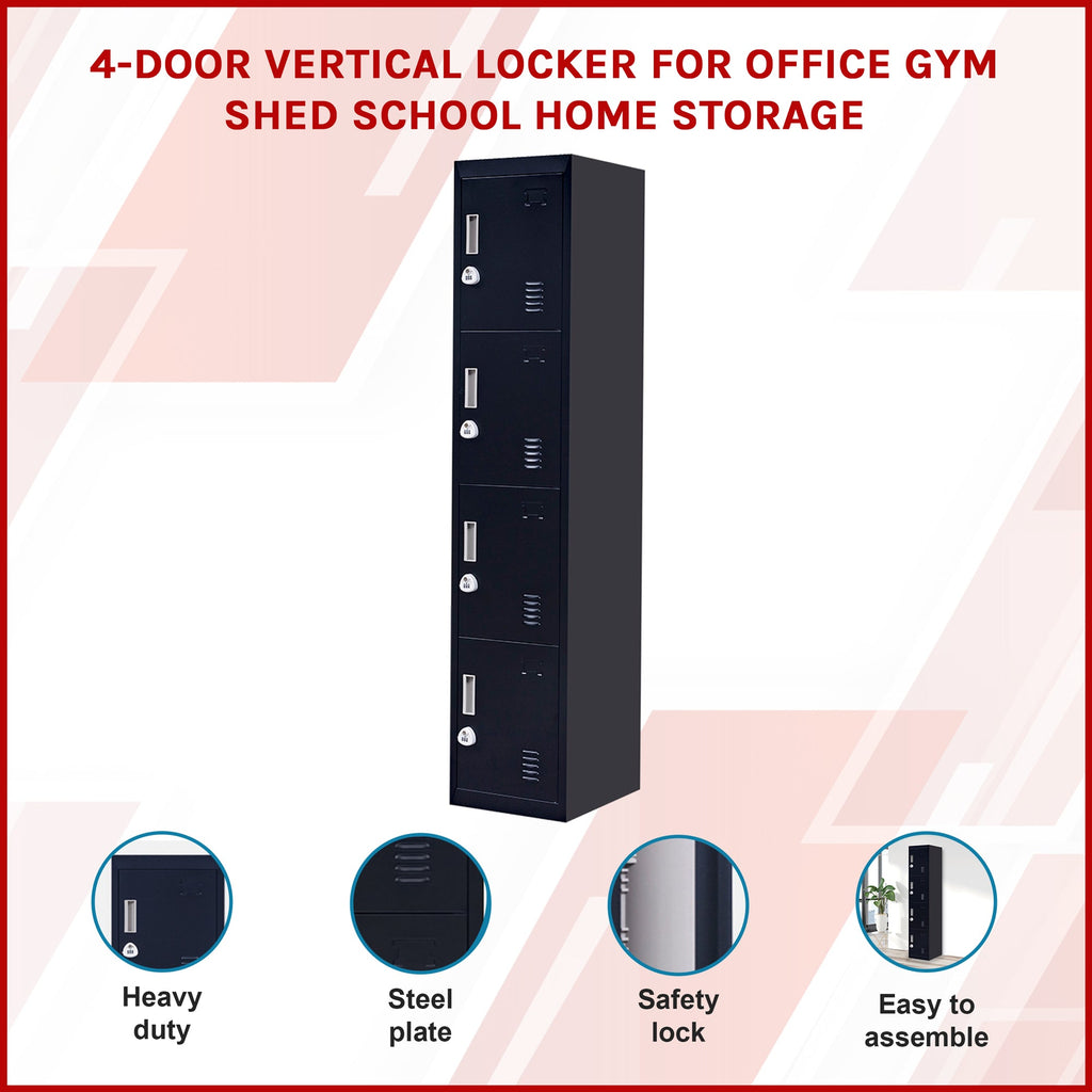 P>Four Vertically-Stacked Lockers Provide A Good Amount Of Room For Small Personal Belongings Purses Textbooks Office Supplies And Much More. This Comes Comes With 3-Digit Combination Lock To Ensure Safety Of Your Items.P>The Locker Is Constructed With Solid Cold-Rolled Steel Plate For Excellent Sturdiness And Durability Not To Mention An Attractive Look. The Steel Is Also Powder-Coated To Resist Corrosion. The Locker Measures 180 X 38 X 45Cm And The Maximum Recommended Weight Capacity Is Approximately 30Kg Per Locker. There Are Spaces Designated For Labels To Help Identify Lockers And Air Vents Are Built-In To Assure Sufficient Ventilation.P>For Even More Storage Consider Buying Two Or More Units Which Can Be Placed Side By Side Where You Need Them. A Simple Design Makes Assembly Easy And Your Locker Could Be Up And Ready In Minutes. Full Assembly Instructions Are Included.P>The 4-Door Storage Locker Will Offer Plenty Of Functional Storage To Satisfy Your Multi-User Storage Needs. Take Advantage Of Our Low Everyday Price And Buy TodayP>Features Of The 4-Door Storage Locker:Ul>Li>4 Lockers Vertically StackedLi>Colour:Strong>Black Li>Lock:/Strong>3-Digit Combination Lock Li>Assembled Locker Dimensions: 180 X 38 X 45Cm H X W X DLi>Packaging Dimensions: 192 X 55 X 7Cm H X W X DLi>Built-In Air Vents For Locker VentilationLi>Privacy And SecurityLi>Recommended Weight Capacity: 30Kg Per LockerLi>Durable Cold-Rolled Steel Plate ConstructionLi>Powder-Coated To Resist Corrosion/Ul>P>Features Of 3-Digit Combination Lock:P>When You Need A Secure Option For Your Lockers Yet Want An Easy-To-Use Backup System This Three-Digit Combination Lock From Salvatore Angelotti Is The Ideal Solution. With A Master Key For Each Order You Can Retrieve The Locker's Contents Even If A User Forgets The Combination. Crafted From Durable Sturdy Metal This Lock Resists Corrosion And Is Nearly Impossible To Crack. With 1000 Possible Numerical Combinations The Lock Ensures ThatAnyone Trying To Break Into Your Locker By Guessing The Code Will Have An Impossible Job.P>It's The Perfect Choice For Schools Gyms Hotels Offices €“ And Even To Organise Your Home's Entry. Resistant To Moisture And Built To Last This 3-Digit Lock Will Keep Belongings Safe Inside The Locker. Just Keep The Master Key In A Safe Place And You'll Have The Best Of Both Worlds €“ A Difficult-To-Guess Passcode And A Backup Plan That Gives You Quick Access If The User Leaves Or Can't Remember The Combination. Order Yours TodayP>Note: Each Order Not Lock Comes With One Master Key Only Regardless Of How Many Different Locker Units Quantities Or Combinations Purchased. A Master Key Is Sensitive In Nature. An Additional Master Key Can Be Purchased On Special Order Only. Locker Assembly Required; Instructions And Hardware Included.P>P>Warning Children Have Died From Furniture Tipover.Ul>Li>Always Secure This Furniture With An Anchor Device.Li>Never Allow Children To Stand Climb Or Hang On Drawers Doors Or Shelves./Ul>P>Attributes:- Colour: Black